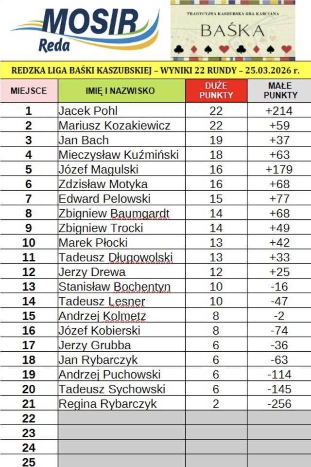 Choć poprzednie rozgrywki wciąż były żywe w pamięci, zawodnicy ponownie zasiedli przy stołach w sali widowiskowej MOSiR Reda, by zmierzyć się w 22. rundzie cyklu. Od pierwszych rozdań było czuć pełną koncentrację, chłodną kalkulację i rosnącą presję bo teraz każdy punkt waży naprawdę dużo.
