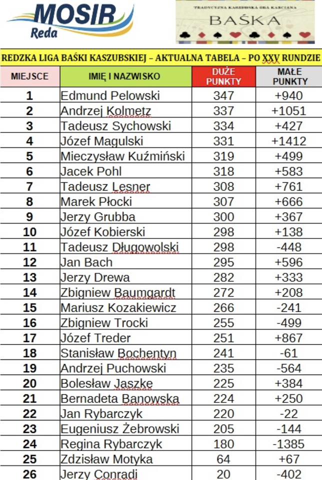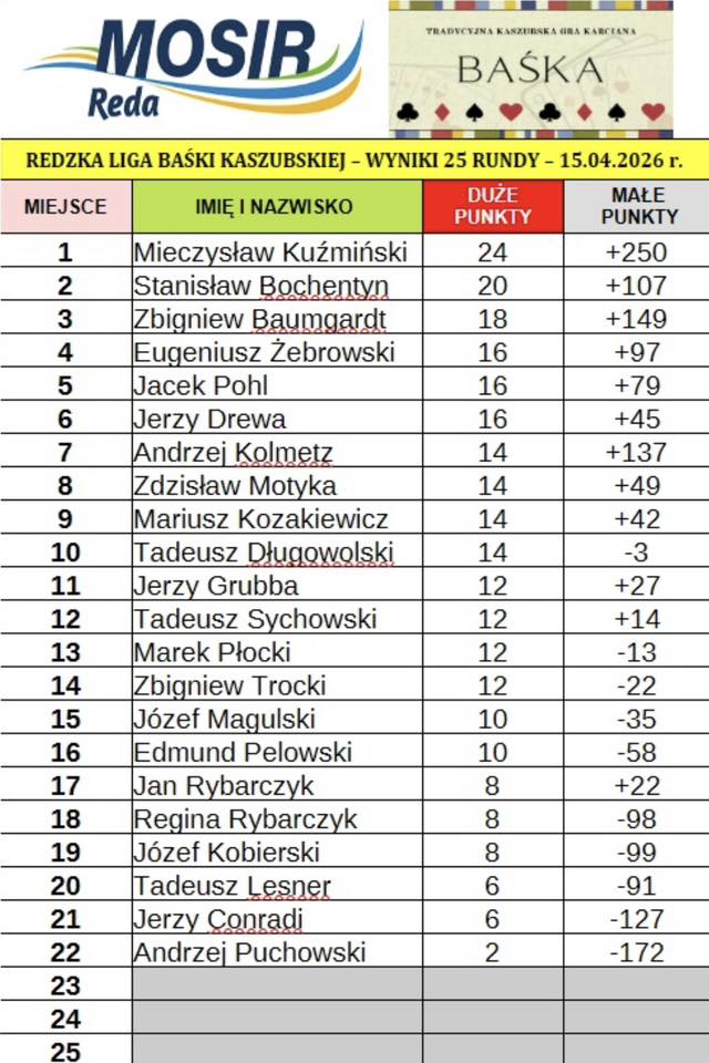 Choć poprzednie rozgrywki wciąż były żywe w pamięci, zawodnicy ponownie zasiedli przy stołach w sali widowiskowej MOSiR Reda, by zmierzyć się w 25. rundzie cyklu. Od pierwszych rozdań było czuć pełną koncentrację, chłodną kalkulację i rosnącą presję jesteśmy już na końcówce, gdzie każdy punkt waży naprawdę bardzo dużo.